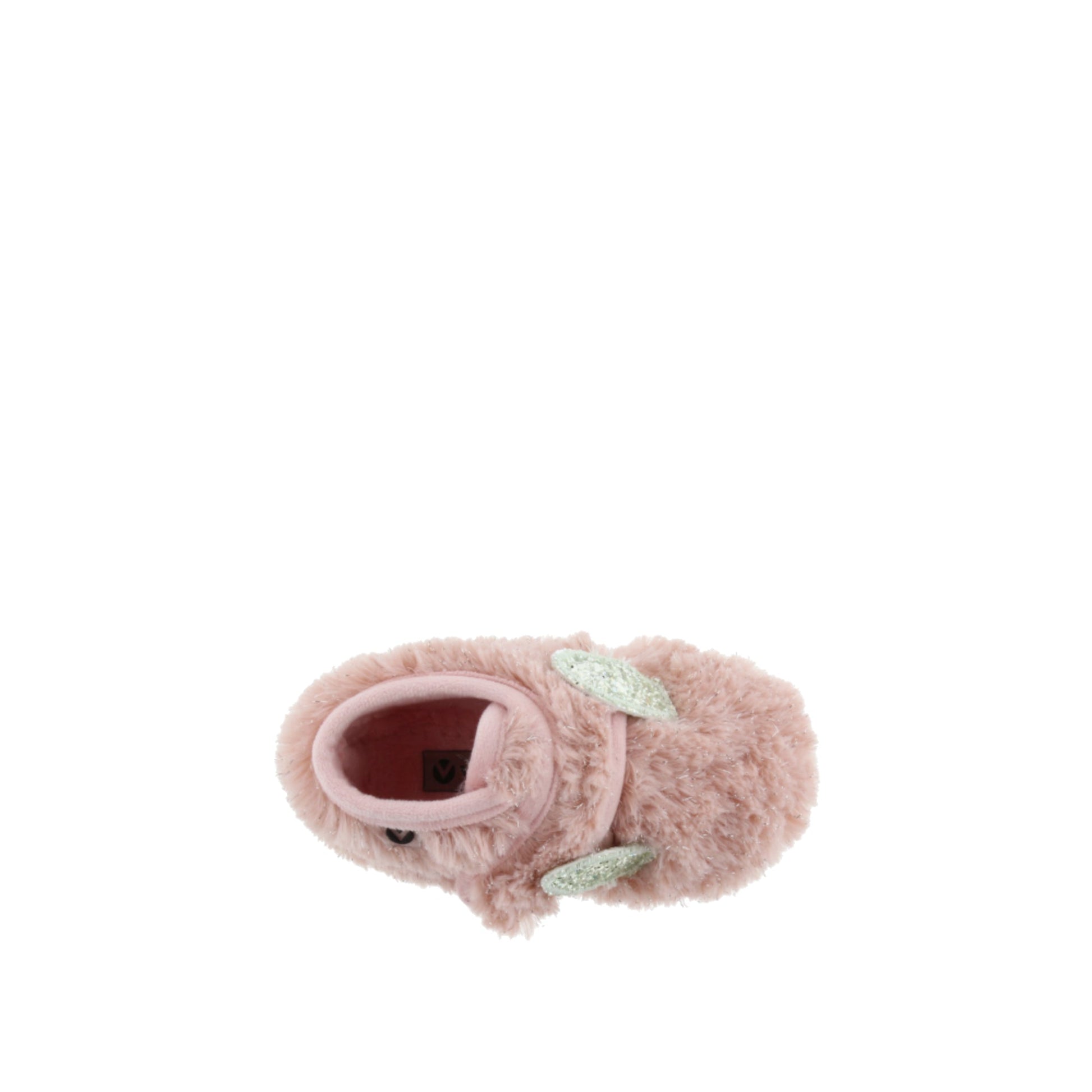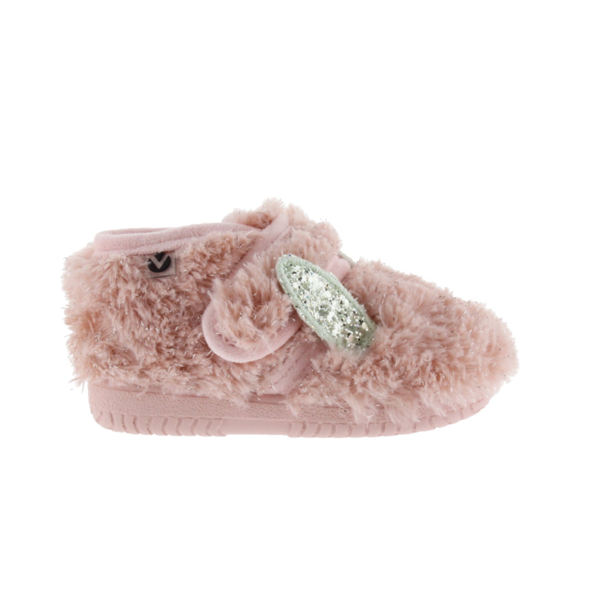 Closed lurex slippers with ears for girls. The hook-and-loop closure allows for easy on and off, encouraging independent movement. Matching vulcanized rubber sole.