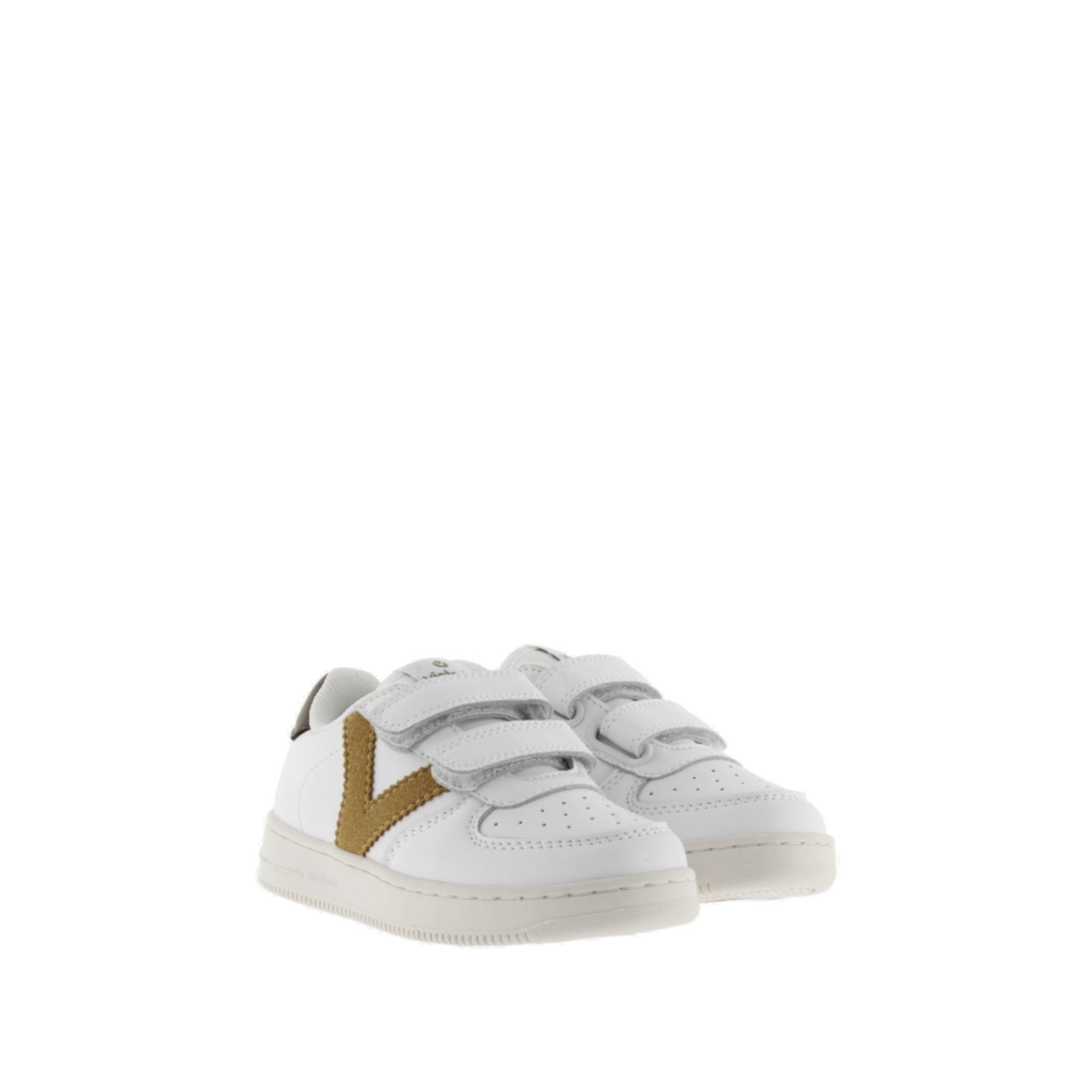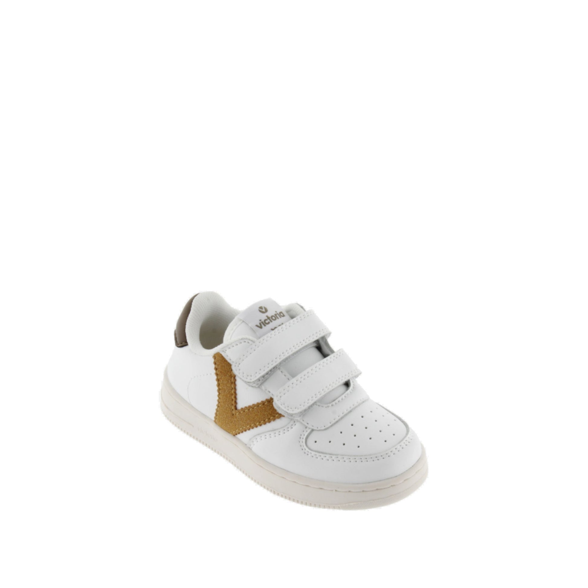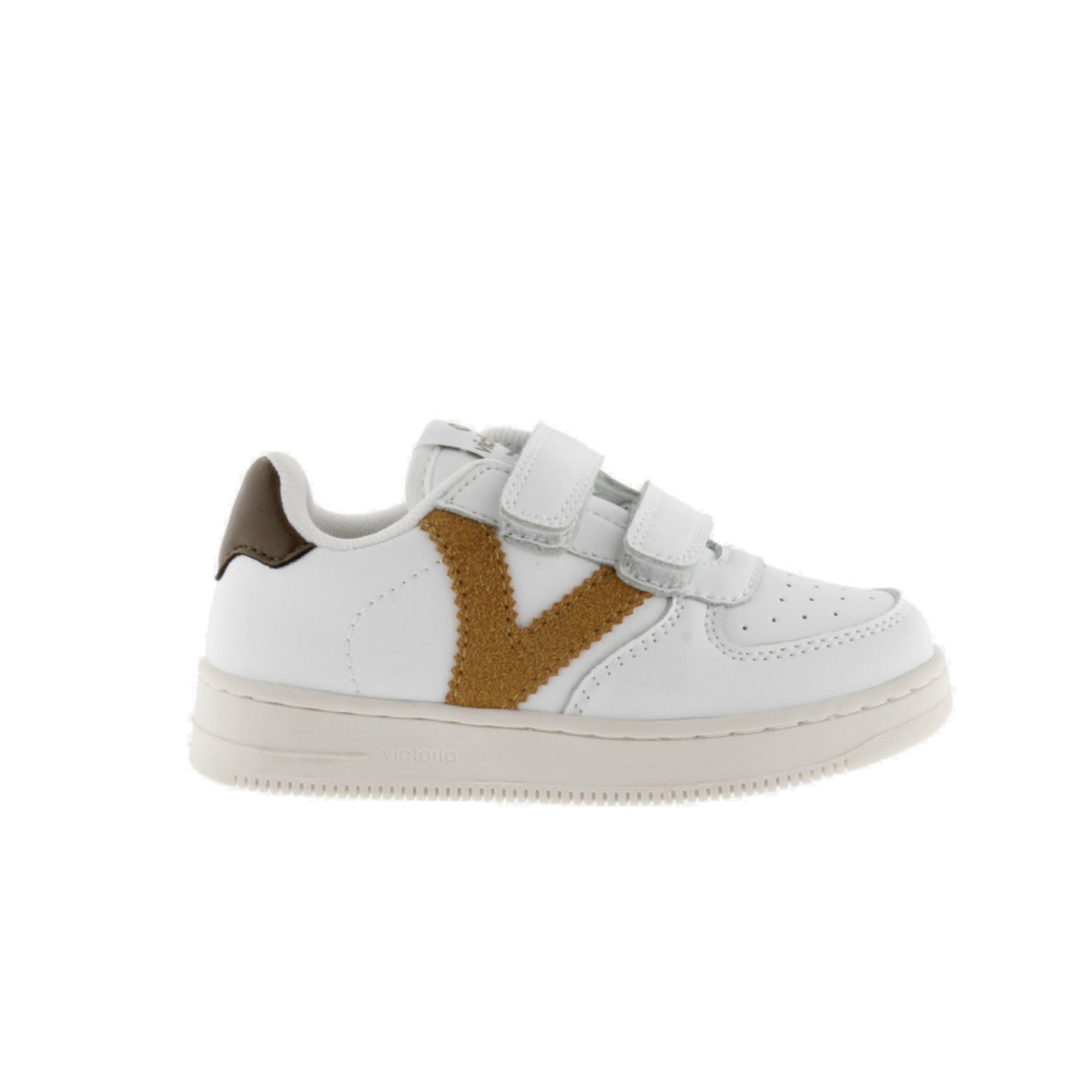 Baskets blanches en similicuir avec le logo Victoria sur le côté et un empiècement arrière contrastant. Elles sont dotées de brides auto-agrippantes (trois pour les pointures 36 et plus), faciles à enfiler et confortables. La semelle est en TPR et le bout est perforé pour une meilleure respirabilité.