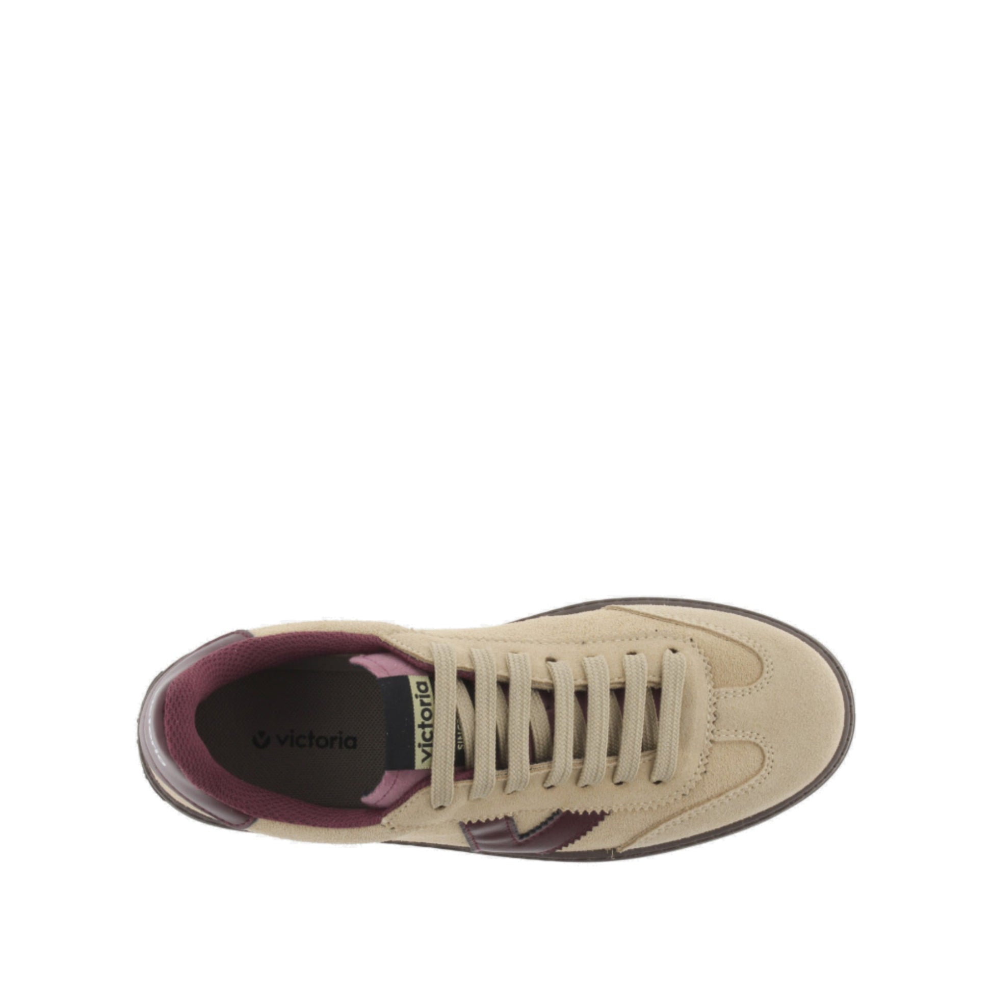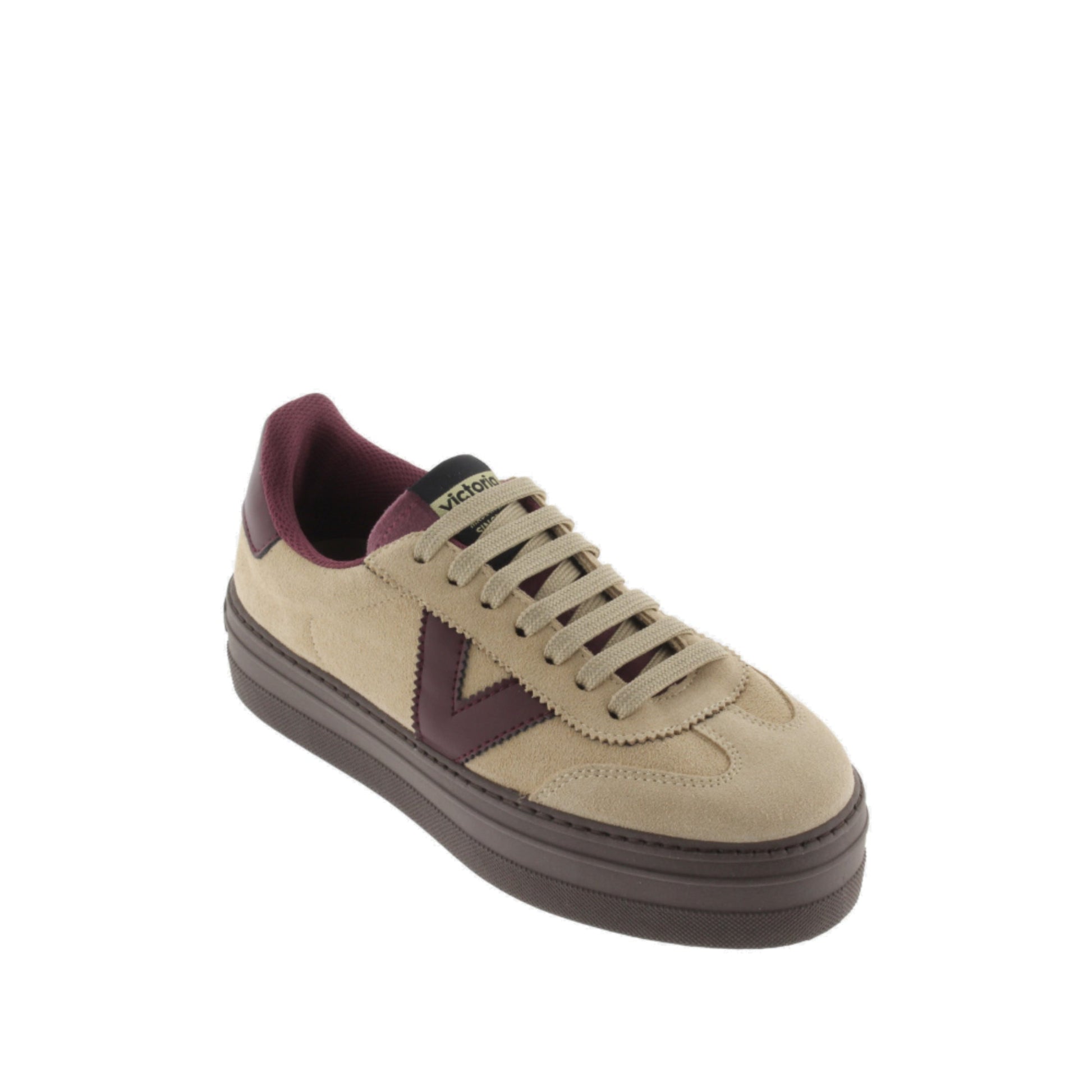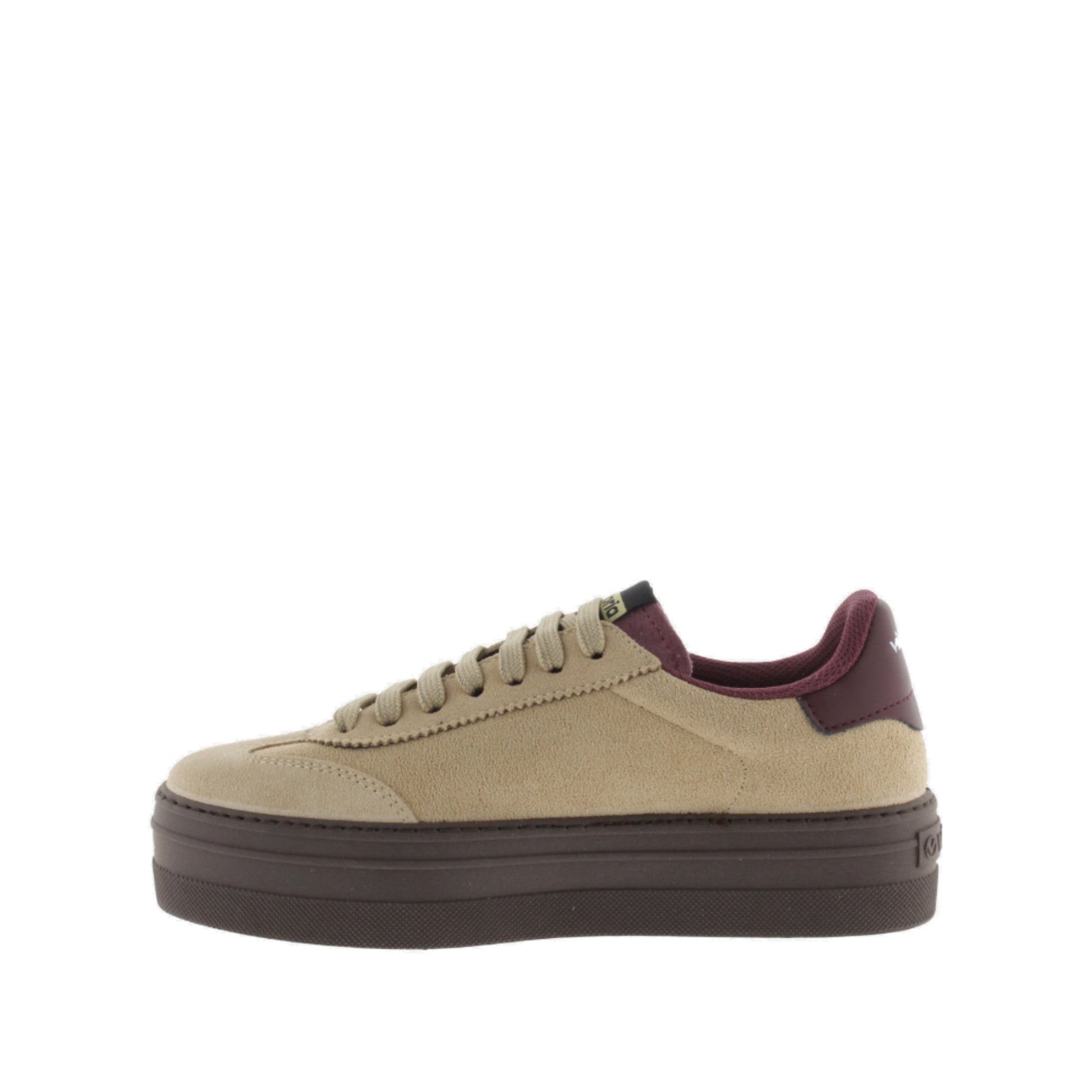 Zapatillas de corte bajo para mujer con plataforma de 4 cm. Fabricadas en España en serraje. El logotipo de victoria lateral y la pieza trasera en colores efecto piel hacen contraste, junto con el forro interior. Cómoda suela de PVC elaborada a base de aceites vegetales en lugar de minerales en color marrón chocolate.