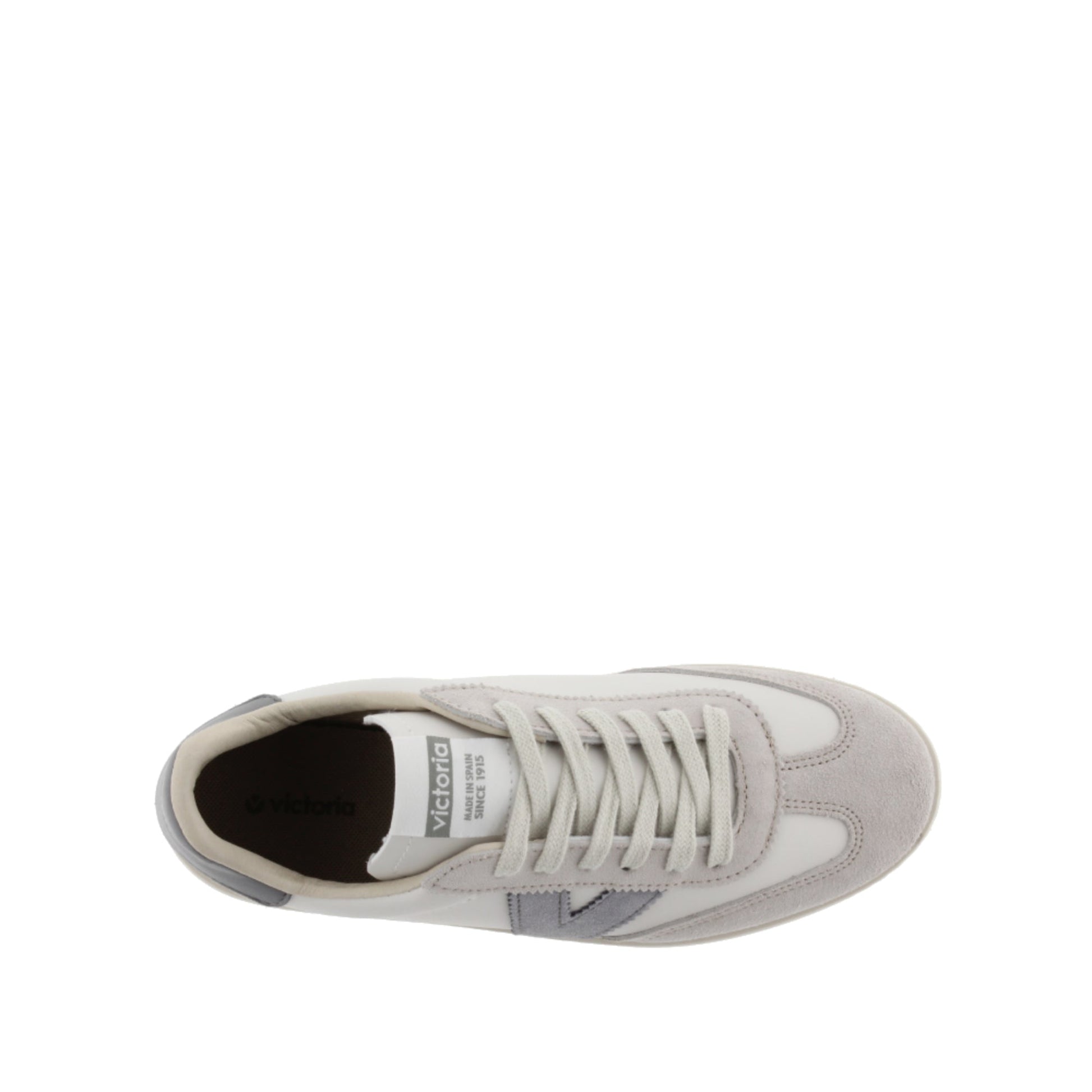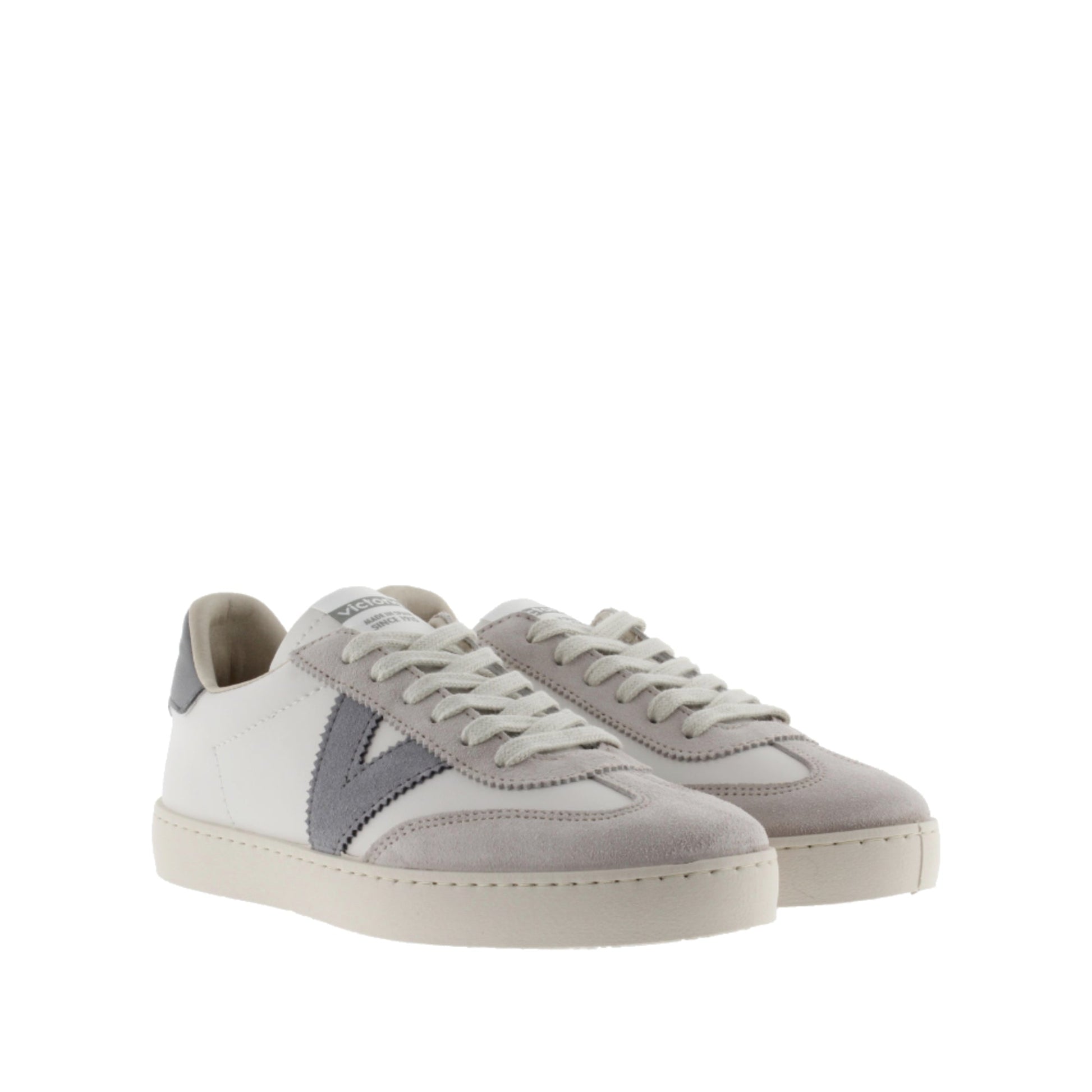 Zapatillas de efecto piel blanca con piezas de serraje en color crudo. Nuevo corte ciclista en la puntera. Se presentan también con el logotipo de victoria lateral y la pieza trasera en colores a juego en contraste. Cómoda suela de PVC a base de aceites vegetales, ligeramente tostada. Made in Spain.