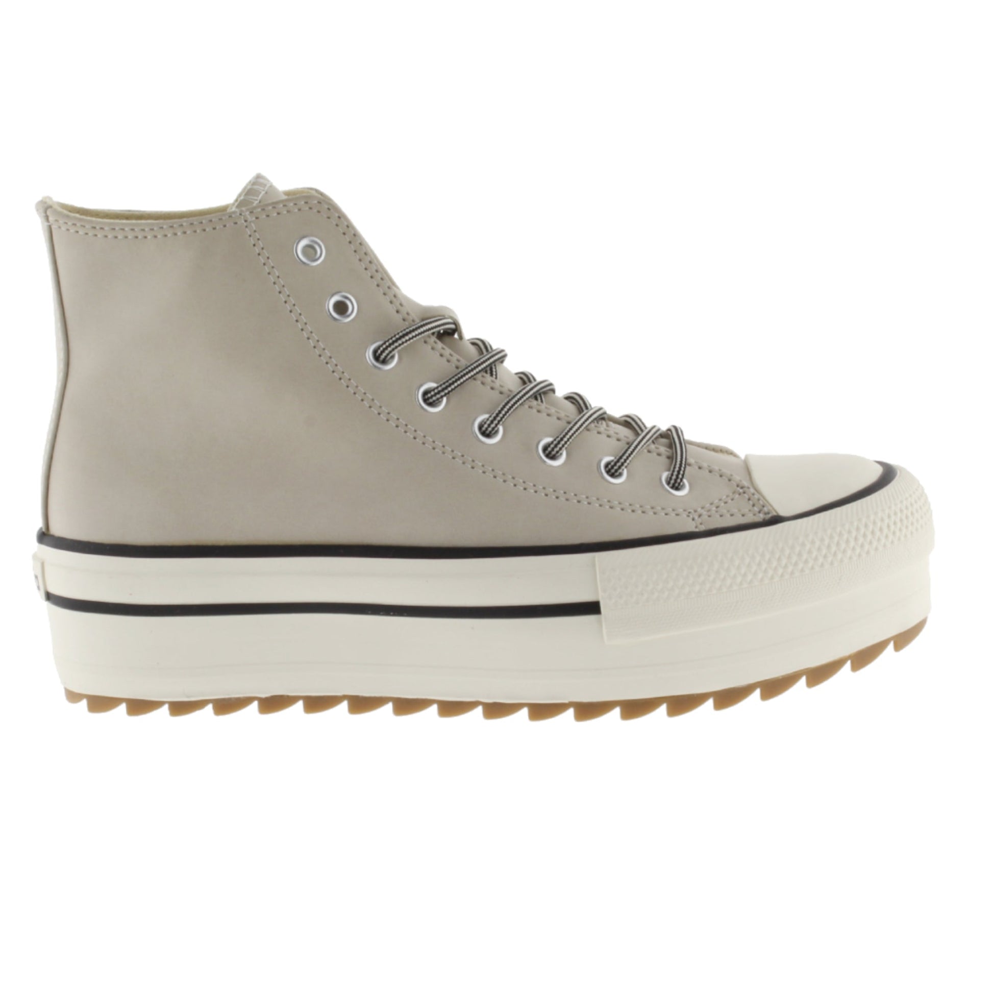 Zapatillas abotinadas estilo basket de efecto piel con suela doble en sierra (4cm). Ésta es de goma con refuerzo en la puntera, para así aportar una mayor durabilidad. Presentan un parche de goma de estilo retro color cuero con el logotipo de victoria en la caña. Su cierre es mediante cordones redondos de nylon.
